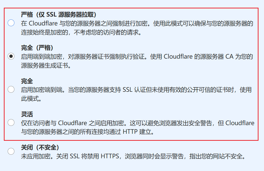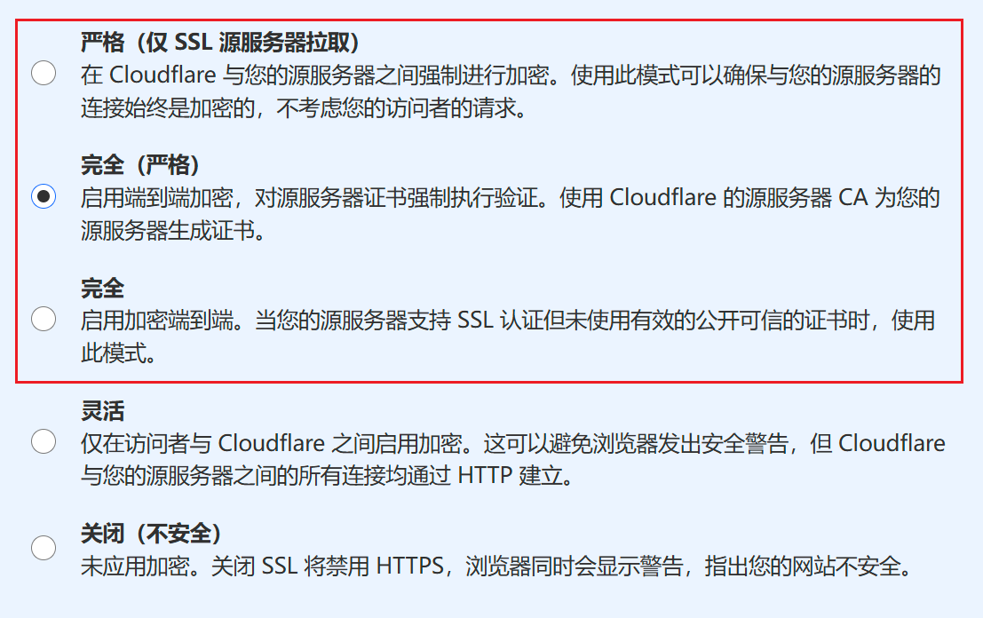 完全(严格):通常由受信任的证书颁发机构(如 Let’s Encrypt、Google Trust Services 或 ZeroSSL)签发或者Cloudflare的CA签发的证书设置为这个。